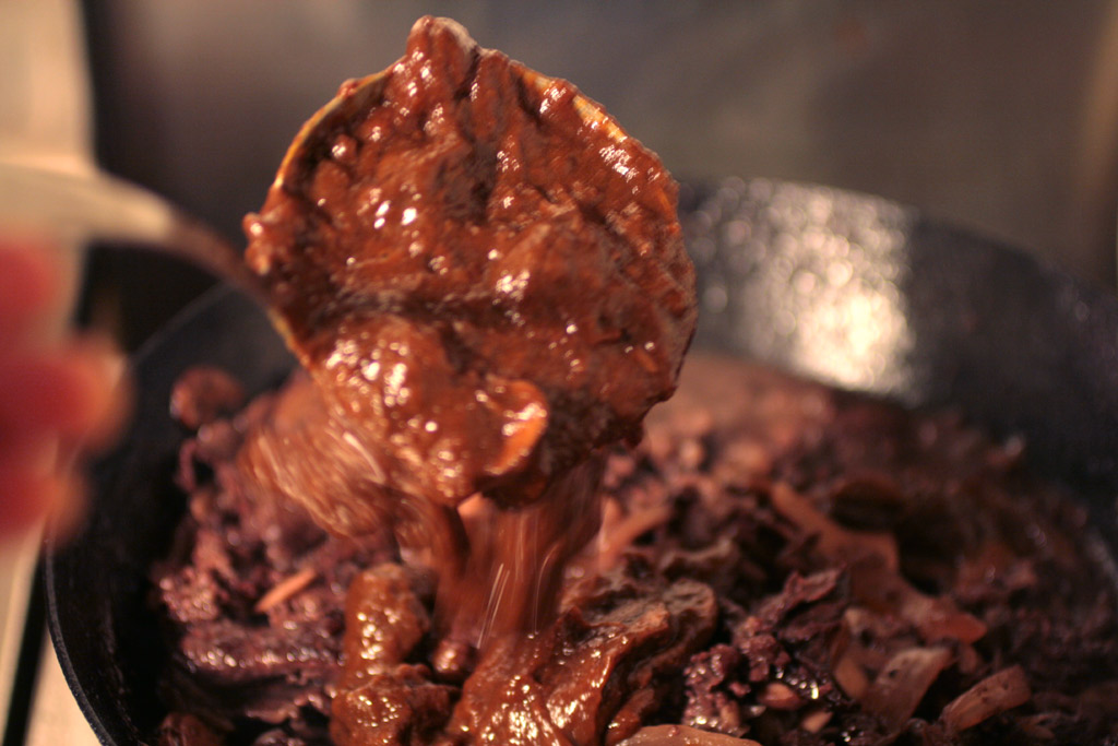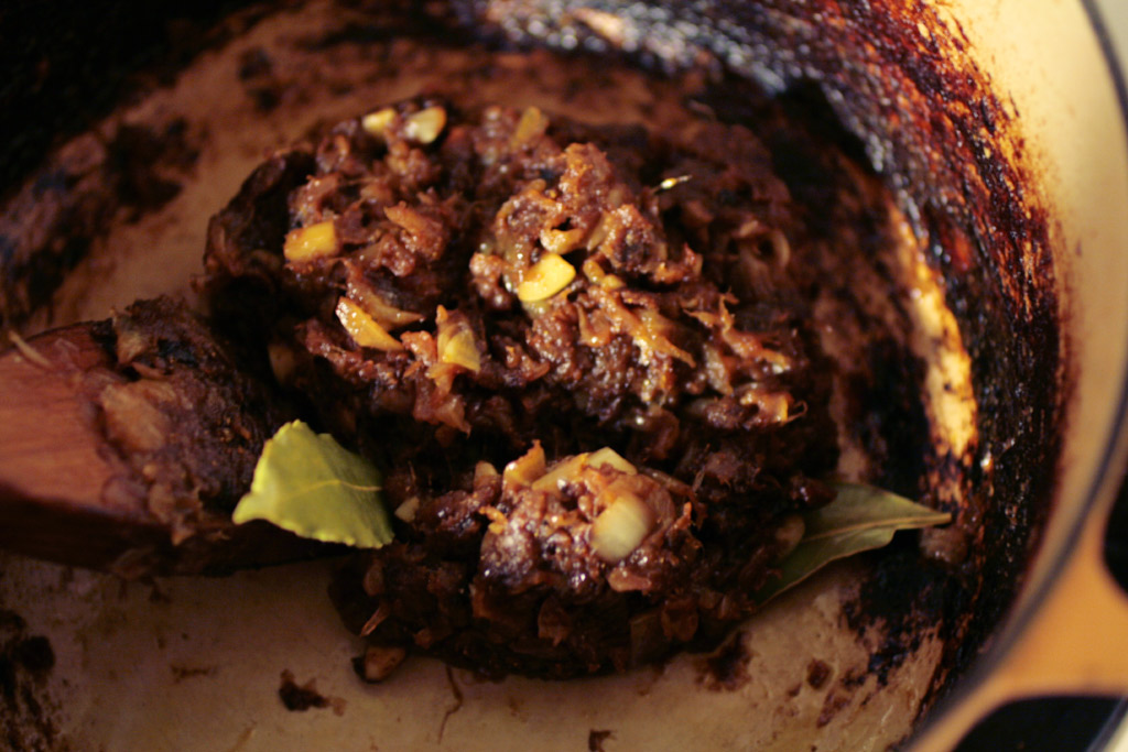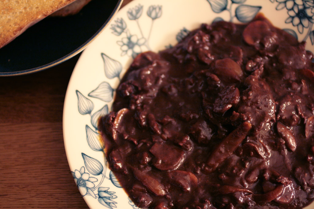 にんにくとたまねぎとマッシュルームを炒めて、赤ワインで1時間くらい煮込んで、ハインツのデミグラスソースと合わせてさらに煮込んだもの。