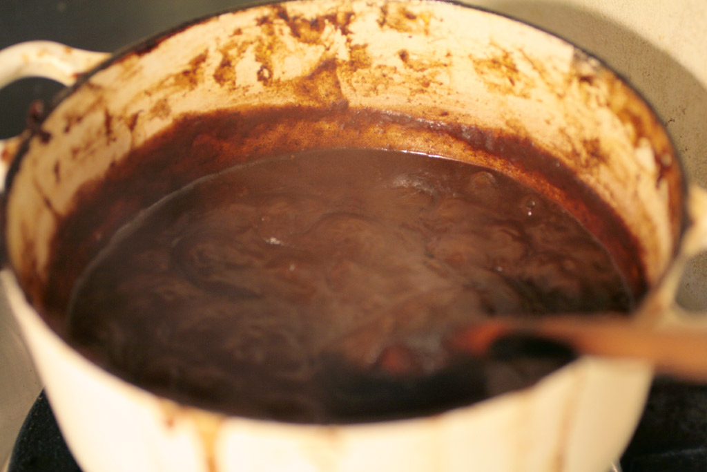 赤ワインの水分が少なくなってきたら、ハンバーグソースの残りを入れる。