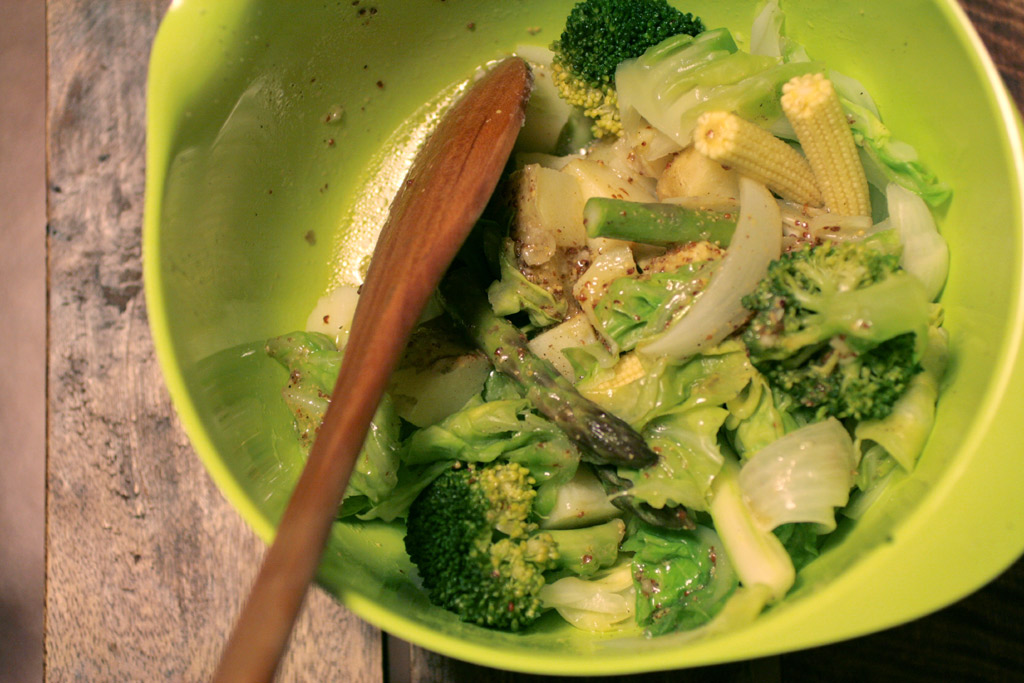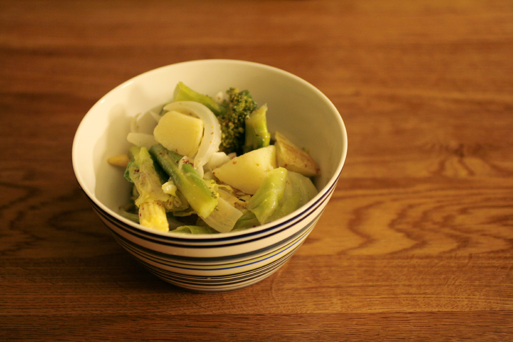春キャベツ、アスパラガス、ヤングコーン、新たまねぎ、新じゃが。じゃがいもだけ別に茹でて、あとはざくざくと切って電子レンジで加熱。