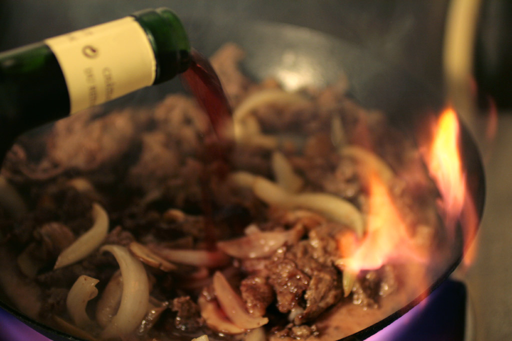 肉に焼色がついたら、たまねぎとマッシュルームを戻して、赤ワインをどぼどぼと入れる。