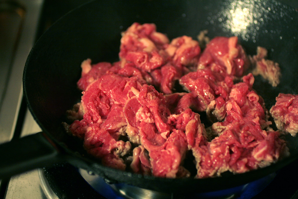 牛肉を焼く。強火で、しっかり焼色をつけるように焼く。