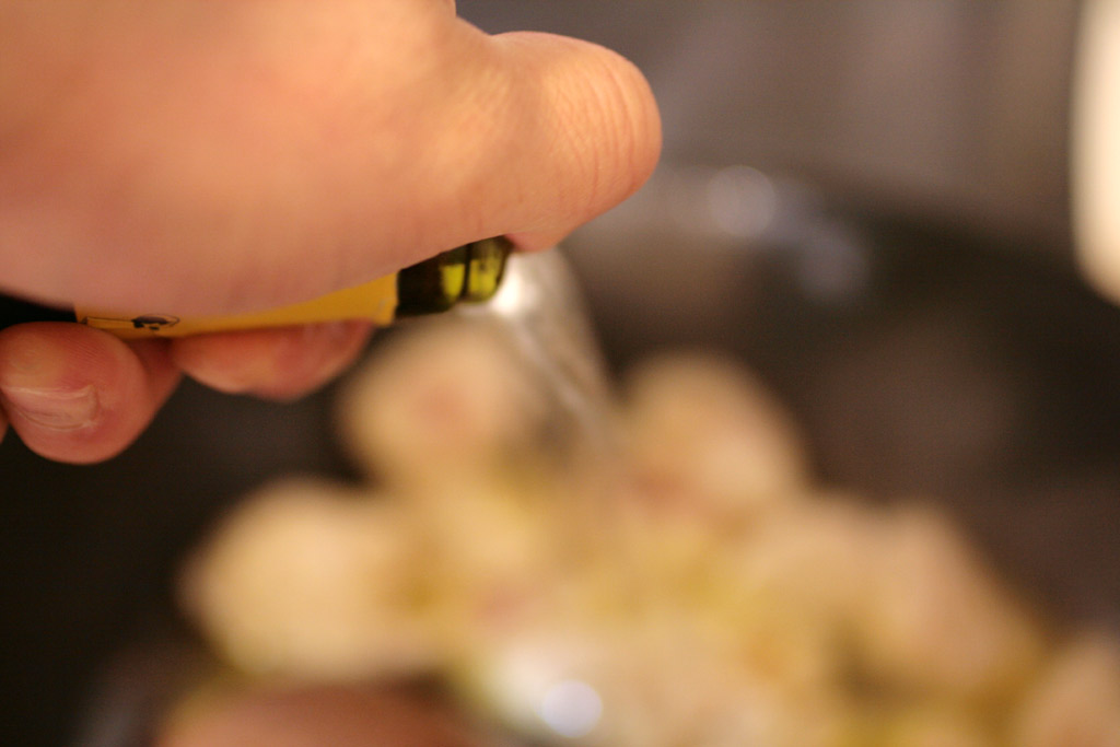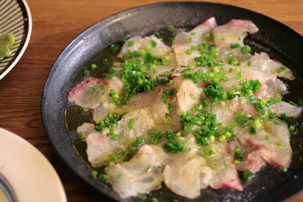 うすく切ってレモン、かつおぶしをのせて醬油をかける。最後にオリーブオイルをかける。