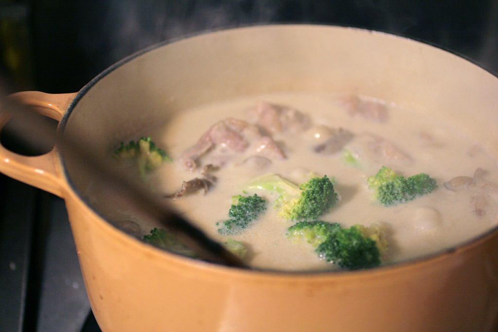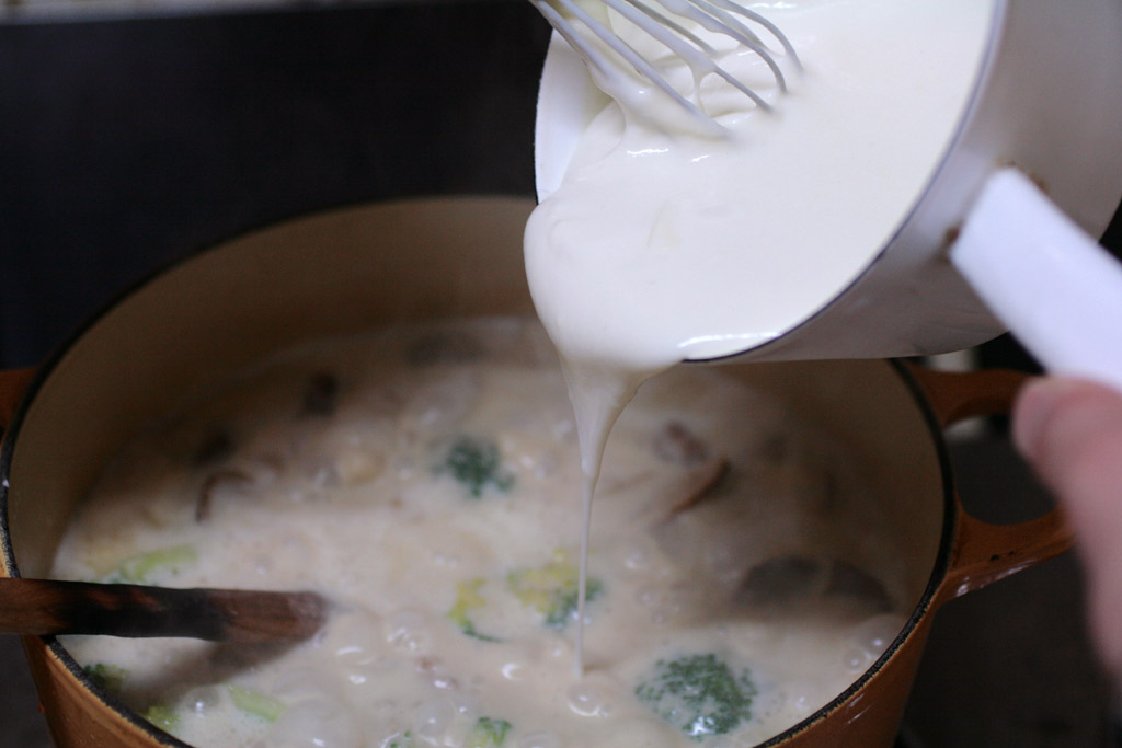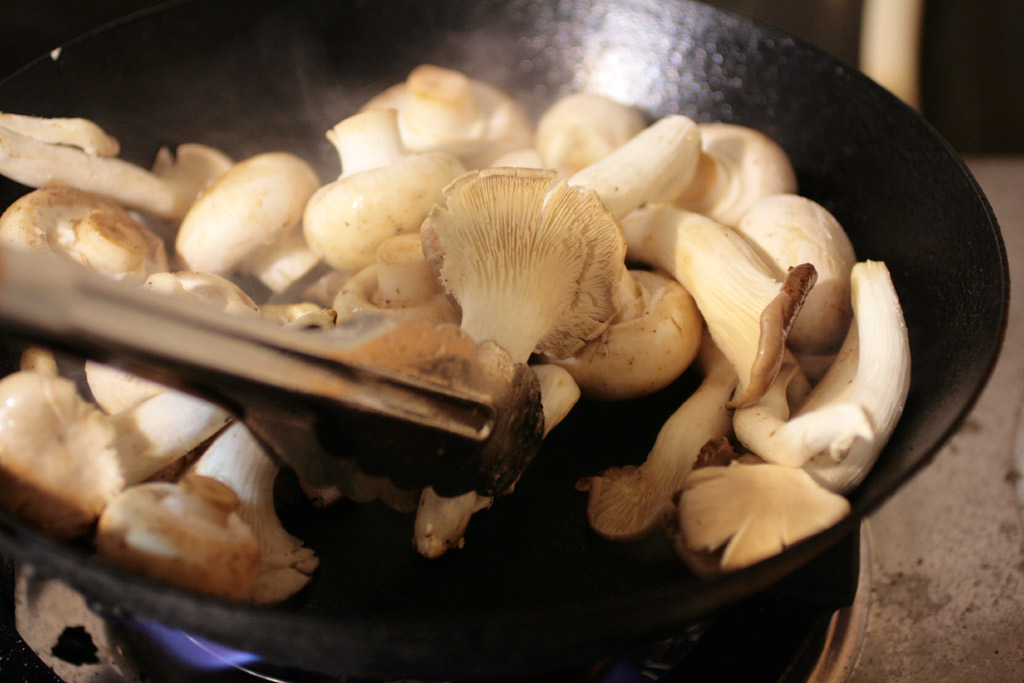 マッシュルーム、しいたけ、うすひらたけとたまねぎ、ベーコン、ゆでたグリーンピースを炒めて、生クリームソースにした。