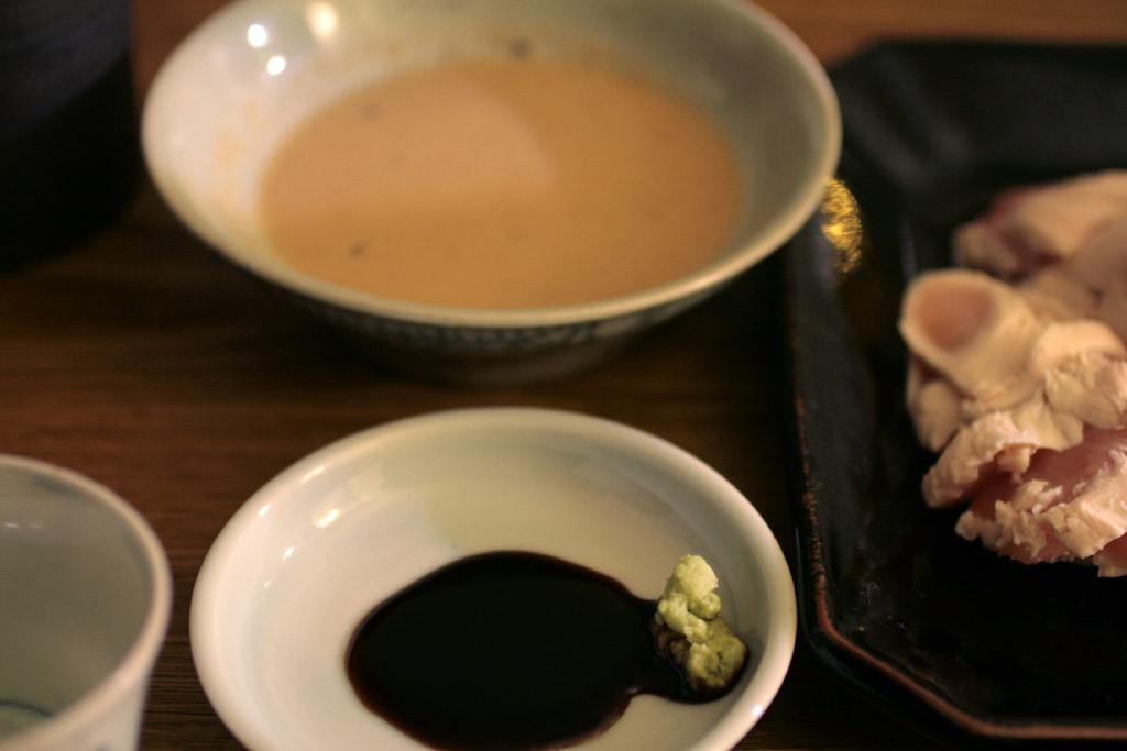 ごまだれは、煎った白ごまをすり鉢でペースト状になるまで擂って、そばつゆでのばす。