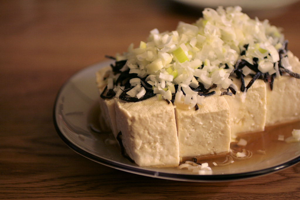 水切りした豆腐に塩昆布を載せ、ごま油をかける。