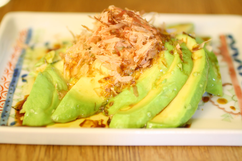 切ったアボカドにレモン汁をかけ、削り節と醬油。それにオリーブオイルをかける。