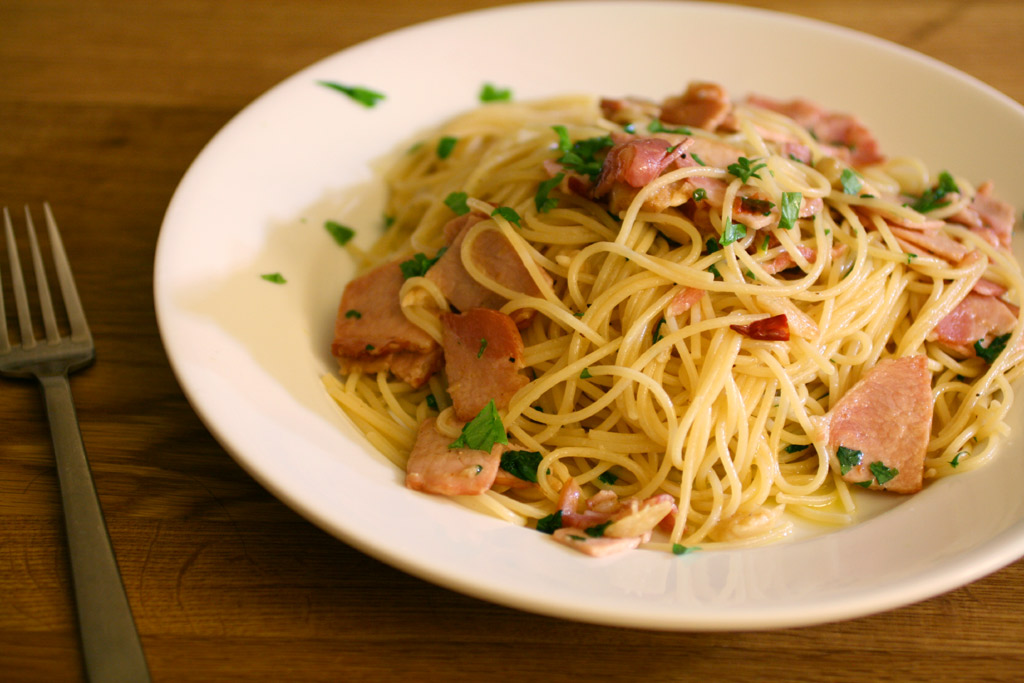 さて、先日のハムがまだ冷凍してあるので、この復活したイタリアンパセリを使ってパスタにする。