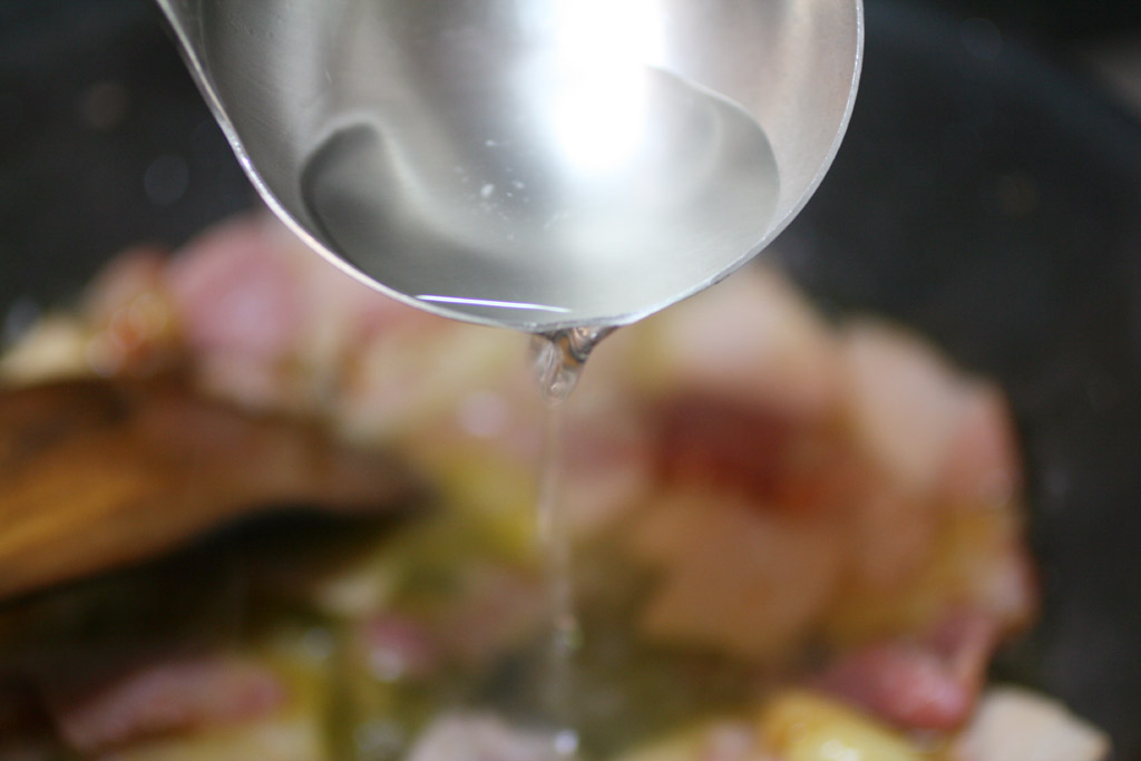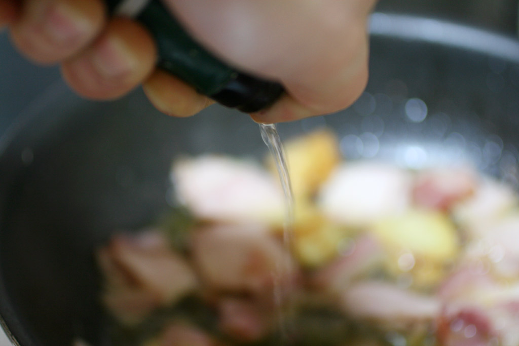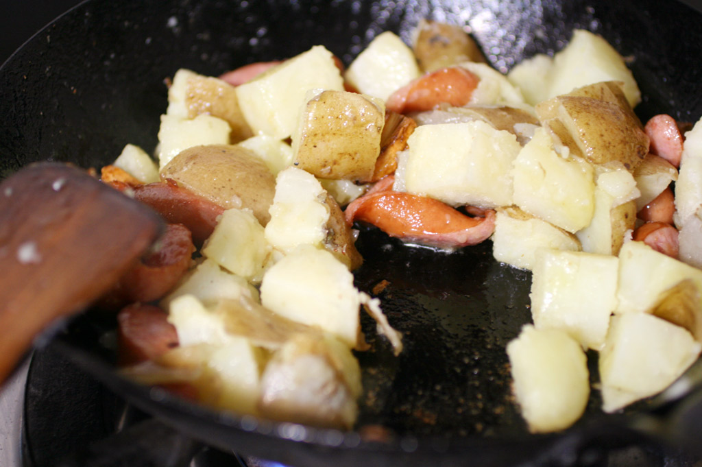 じゃがいもは下茹でしてコロコロに切る。ハムも適当に切る。ハムはおいしくなくてはいけない。ボンレスハムみたいなのではないまともなハムを厚切りにして使う。