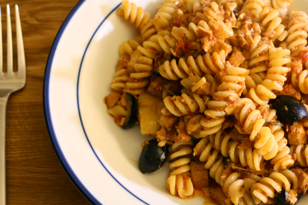 パスタは、前の日に作ったカジキマグロのラグーソース*2が余っていたので、オリーブを加えてプッタネスカ風にしてフジッリにした。