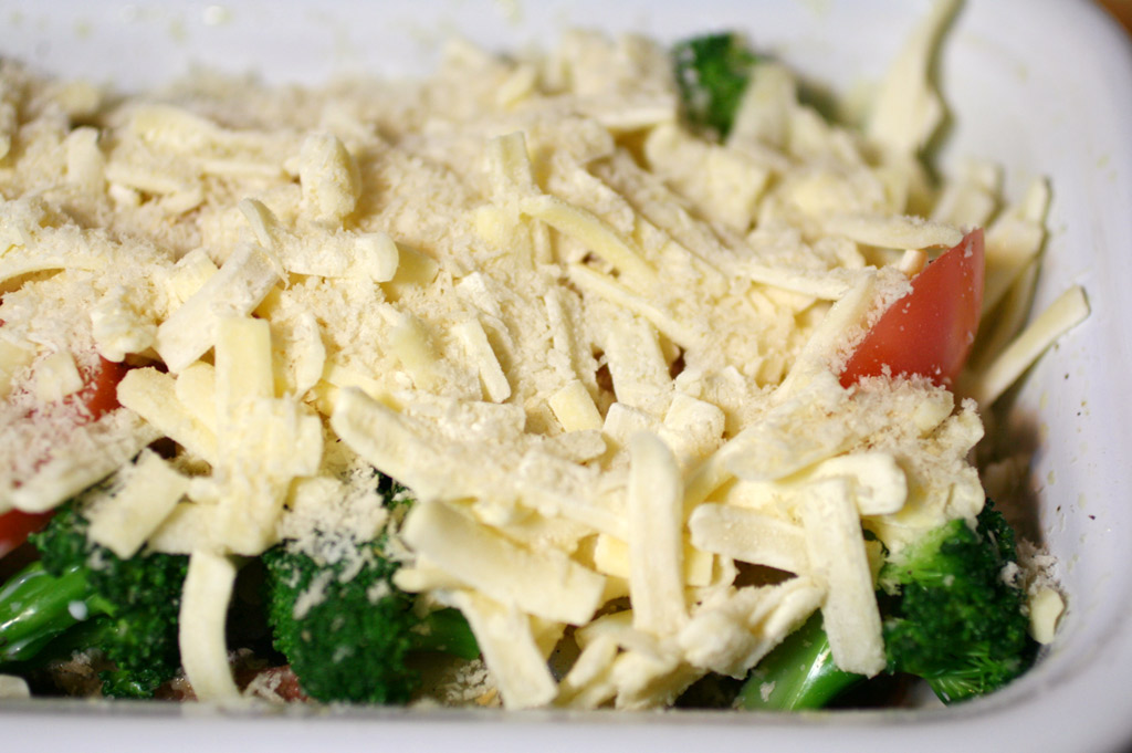 耐熱皿に、じゃがいもとウインナ・ソーセージ、トマト、軽く茹でたブロッコリーを並べ、ピザ用チーズ、パルミジャーノレッジャーノのすりおろし、パン粉をかけてオーブンでいい焦げ目がつくまで焼く。