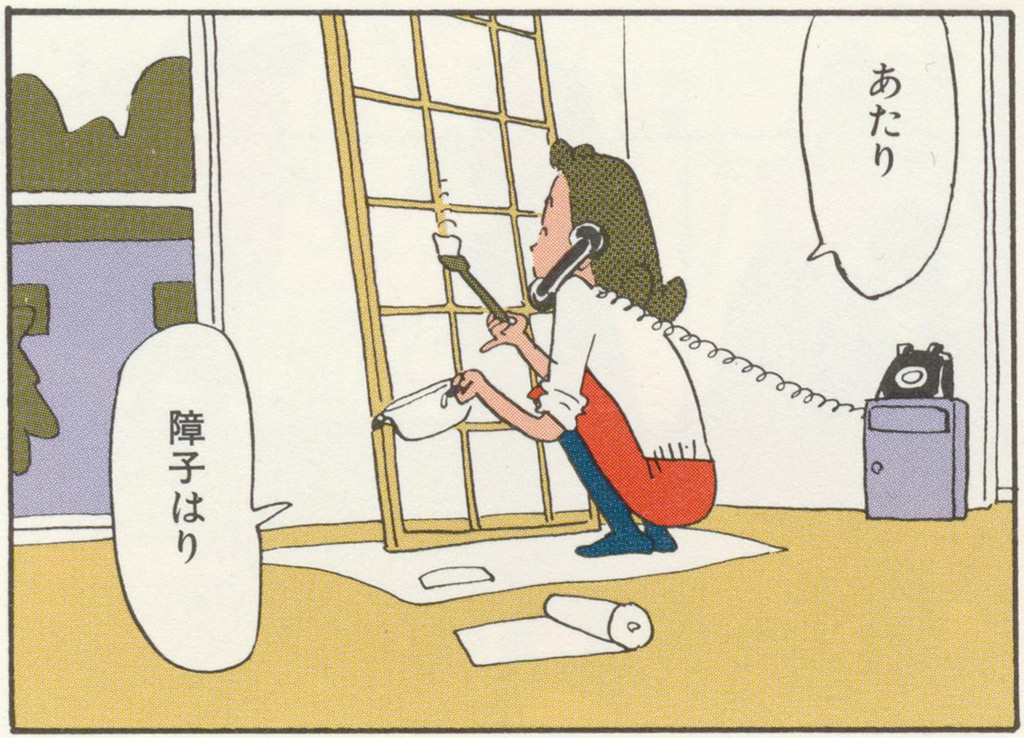 えっちゃんの電話を蔑ろにしつつ、るきさんは障子はりをしている。