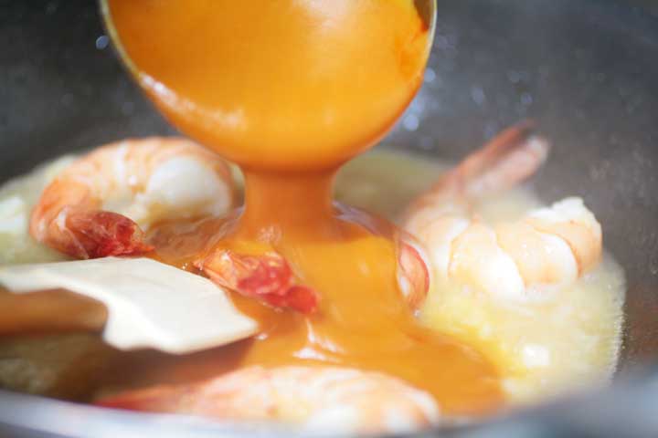 アメリカンソースは、エビの頭や殻を煮込んで取ったフランス料理のだしのひとつである。