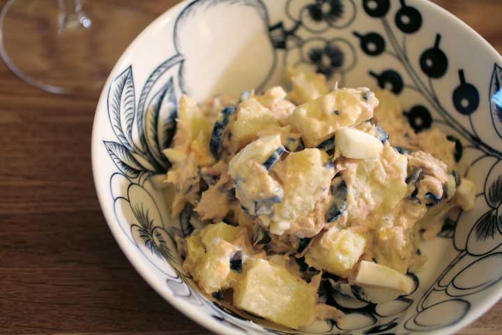 じゃがいもとツナとゆでたまごとブラックオリーブをマヨネーズで和えたもの。