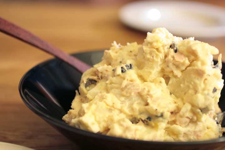茹でたじゃがいも、ブラックオリーブ、ゆでたまご、ツナを塩、胡椒、マヨネーズで和える。