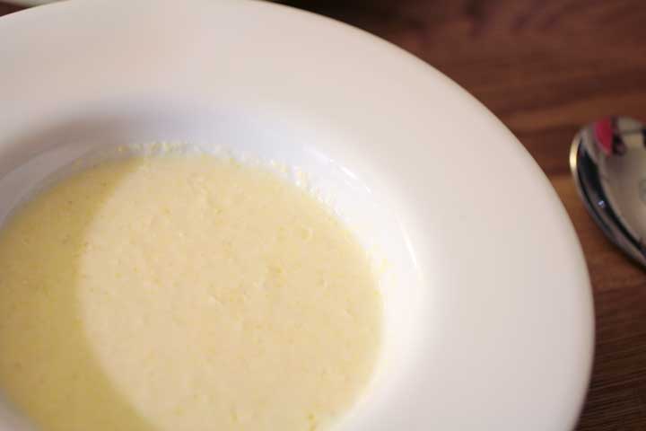 このスープは、電子レンジで加熱したとうもろこしをフードプロセッサーで砕いて、牛乳でのばして塩を振っただけの簡単なもの。