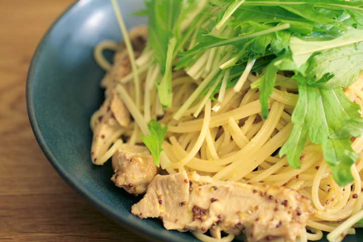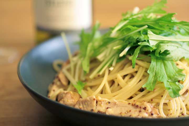 鶏肉と水菜のマスタードソースのスパゲティー。