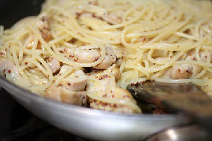 パスタの茹で時間が残り1分くらいになったところで、粒マスタードを入れ、塩、胡椒で味を調える。