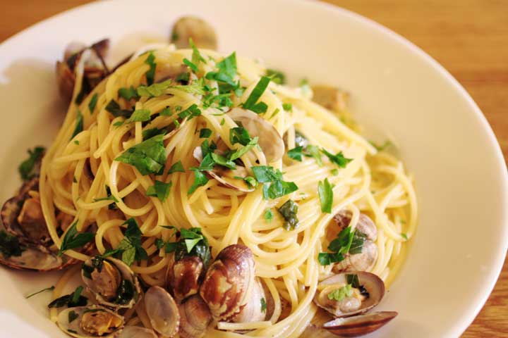 あさりが全て開いたら、蓋を取り、パスタの茹で汁を加え、乳化させる。胡椒を挽く。