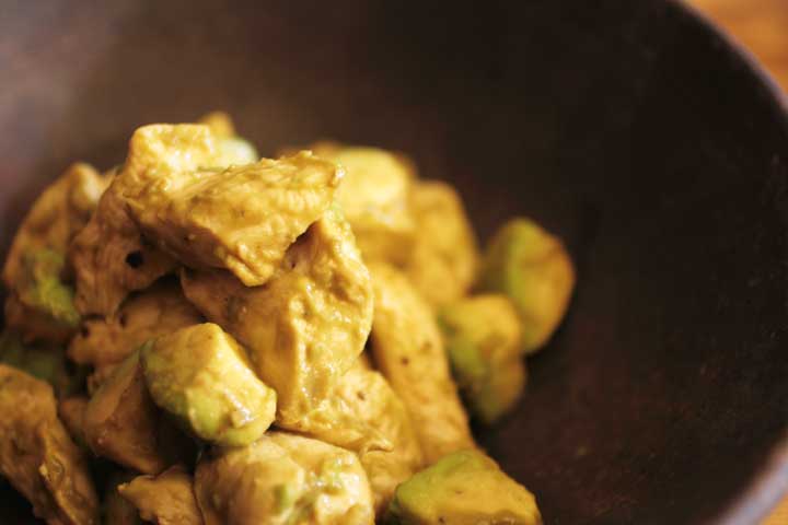 茹でたムネ肉とアボカドをわさび醬油で和える。