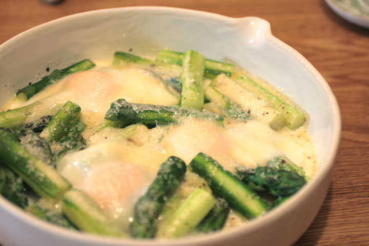 茹でたアスパラガスと蚕豆を、塩、胡椒、レモンで和えて、オリーブオイルをたっぷり。パルミジャーノ・レッジャーノのすりおろしをかける。