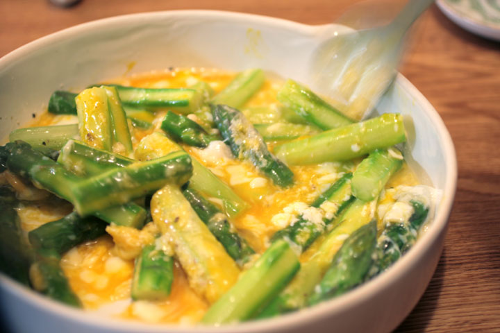 溶いたたまごを入れ、火を止めて余熱で全体をからめる。