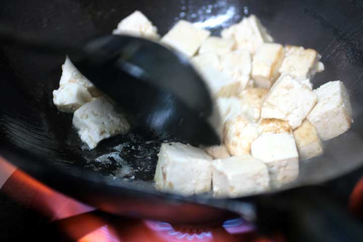 - 豆腐は水をしっかり切って、2cm角に切る。