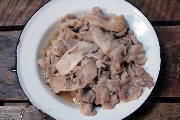 - 豚肉(ばら肉、もしくはロース薄切り肉)は食べやすい大きさに切って塩、胡椒。