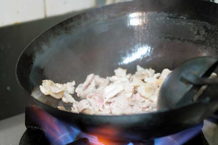 中華鍋に油を熱し、豚肉を強火で炒める。