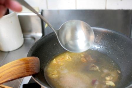 白ワインをふり入れ、フライパンをゆすりながら水分を飛ばす。