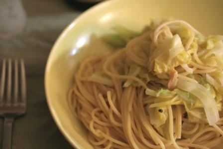 パスタの茹で時間が残り2,3分になったら、パスタ鍋にキャベツを入れ、一緒に茹でる。
