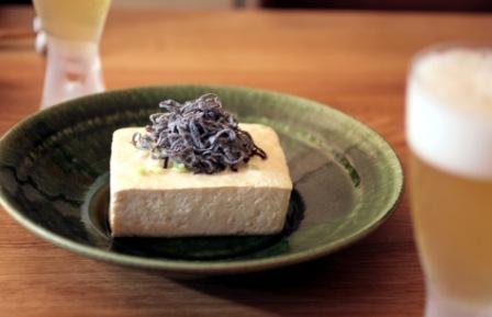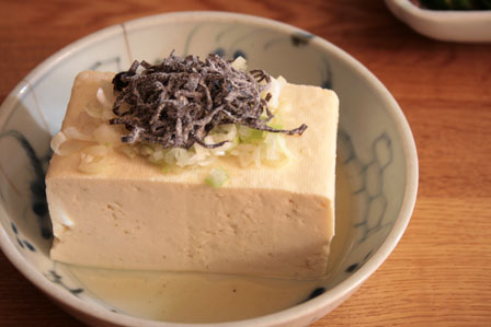 お豆腐にごま油をひとたらし、ねぎのみじん切りと塩昆布を乗せる。