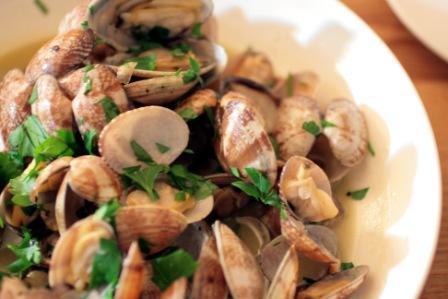 砂出ししたあさりをにんにくとオリーブオイルで炒めて、白ワインを入れて蓋をして蒸らす。貝が開いたら塩、胡椒で味を調え、イタリアンパセリを散らして完成。