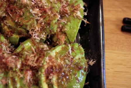 アボカドはレモンを搾って、削り節をたっぷりと醬油、オリーブオイルをかける。