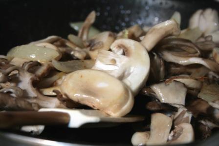たまねぎが半透明になったら、きのこを入れて炒める。