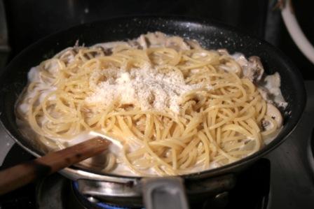 茹で上がったパスタとパルミジャーノ・レッジャーノのすりおろしを加え、しっかり和えたら完成。