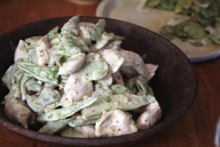 鶏ムネ肉、蚕豆、アスパラガス、スナックえんどうをマスタードとマヨネーズで和えたもの。