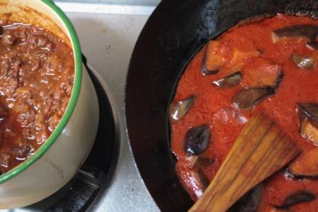 ミートソースと茄子のトマトソースを作る。