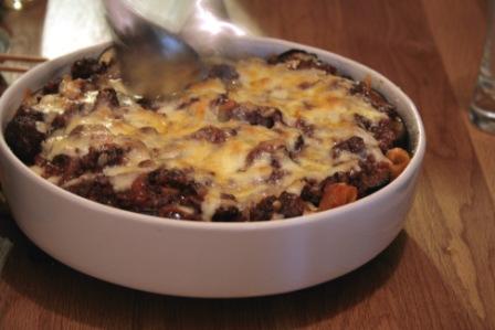 茹でたコンキリエを茄子のトマトソースで和えておく。耐熱皿に、下からコンキリエ→オリーブオイルで炒めた米茄子→ミートソース→ピザ用チーズ→パルミジャーノレッジャーノの順番で重ねて、オーブンで焼く。