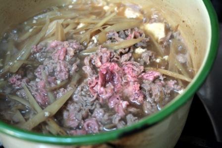 先日、来客があったときに蕎麦を出そうとして叶わず、そばつゆが大量に残っている。だから、割り下を作って肉豆腐にしようと思ったのだ。牛蒡もたっぷり入れて。