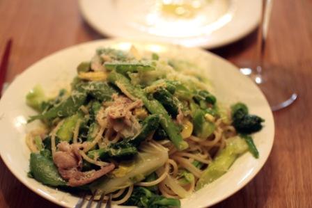 豚ばら肉、春キャベツ、菜の花、アスパラガス、スナックえんどう、ヤングコーンを入れたオイルソース、パルミジャーノのすりおろしをかける。