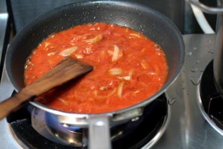 手でつぶしたホールトマトを入れて煮込む。