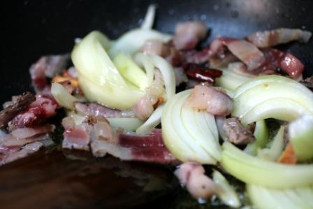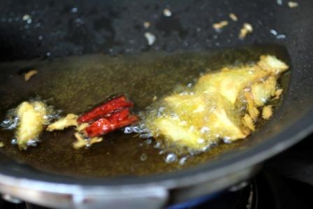 にんにくと唐辛子のオイルを作る。アラビアータは辛味と唐辛子の香りが身上なので、鷹の爪を多めに入れる。
