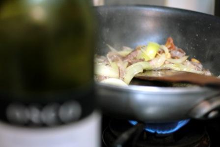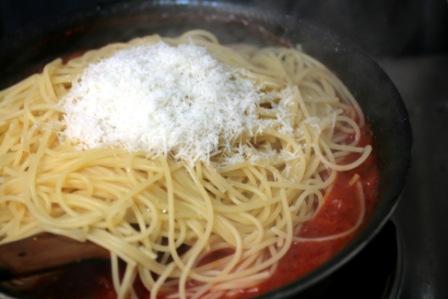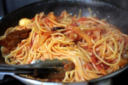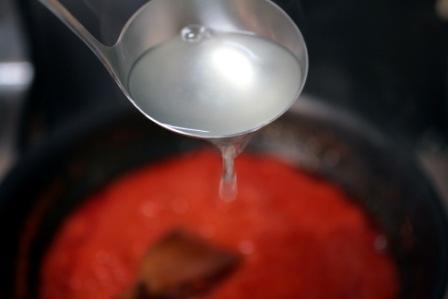 ソースが煮詰まってきたら、パスタの茹で汁でのばす。