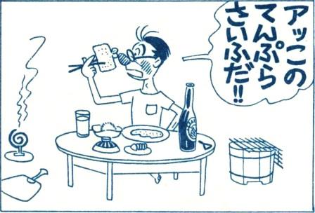 Tシャツに半ズボンであることや、蚊取り線香を焚いていることなどから、季節は夏だ。お櫃も用意してあるということはちゃんとごはんも炊いたのだ。そしてビール。財布以外の天ぷらのタネは何だろう。鱧(ハモ)ってことはないだろうから、イカあたりが妥当だろうか…。
